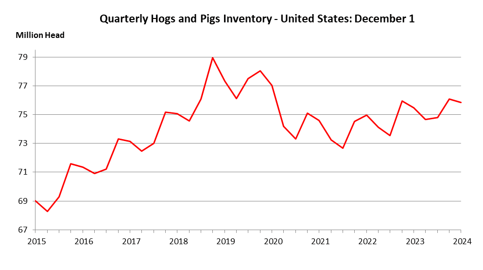 WASHINGTON, Dec. 23, 2024 – As of Dec. 1, there were 75.8 million hogs and pigs on U.S. farms, up 1% from December 2023, but down slightly from Sept. 1, 2024, according to the Quarterly Hogs and Pigs report published today by the U.S. Department of Agriculture’s National Agricultural Statistics Service (NASS).