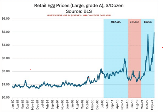 As Secretary Rollins discussed, the Biden administration failed to lead on this issue. The data reveals that over the past 40 years, egg prices were the highest during the Biden years. See the chart below.