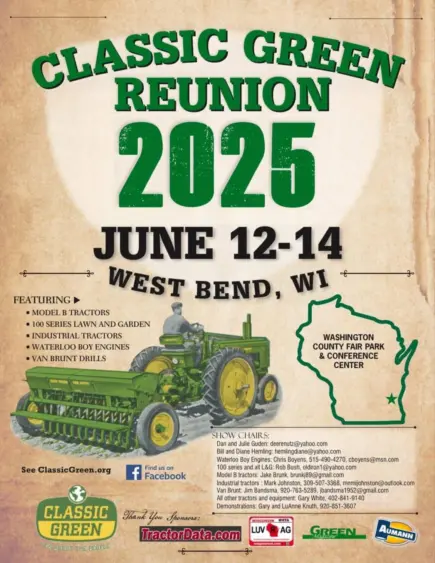 (Janesville, Wisconsin) — Join John Deere collectors from across the US and Canada at the Classic Green Reunion 25 June 12-14 at the Washington County Fair Park & Conference Center in West Bend, WI.