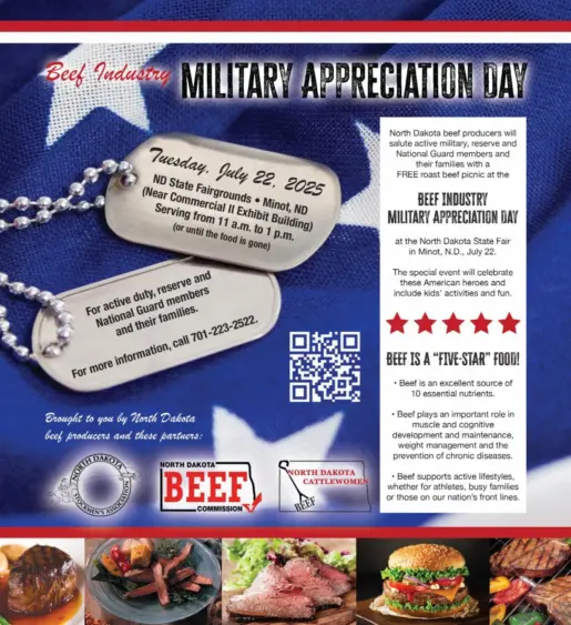 North Dakota beef producers will be saluting active-duty military, reserve and National Guard members and their families at the 20th annual Beef Industry Military Appreciation Day during the North Dakota State Fair in Minot, N.D., on July 22. The event is hosted by the North Dakota Beef Commission, North Dakota Stockmen’s Association (NDSA) and North Dakota CattleWomen and will include a free roast beef picnic and children’s activities.