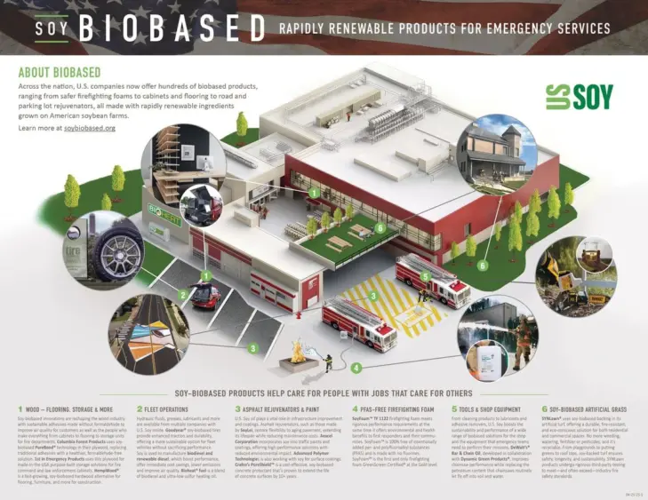 The innovation doesn’t stop at fuel. Soy is also found in more than 1,000 consumer products, from PFAS-free firefighting foam, which can potentially utilize the protein from 12 million bushels of soybeans, to synthetic turf, shoes, tires, plastics, plywood, and even emergency services [see accompanying infographic]. A surge in demand for soy-based products across various sectors is helping to diversify markets and keep farm families in business.