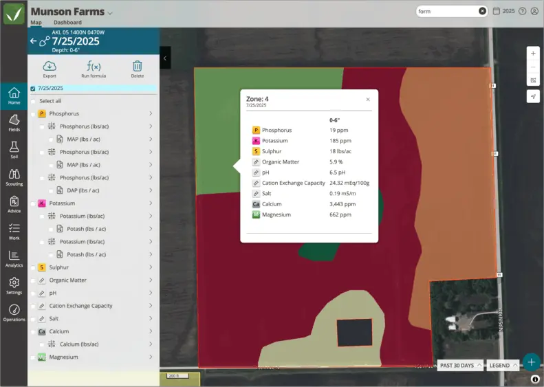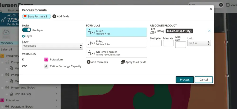 Agronomists can define formulas using soil test data, yield goals, and industry-standard recommendations—then customize outputs with built-in controls for minimum and maximum rates, multipliers, and product selection.