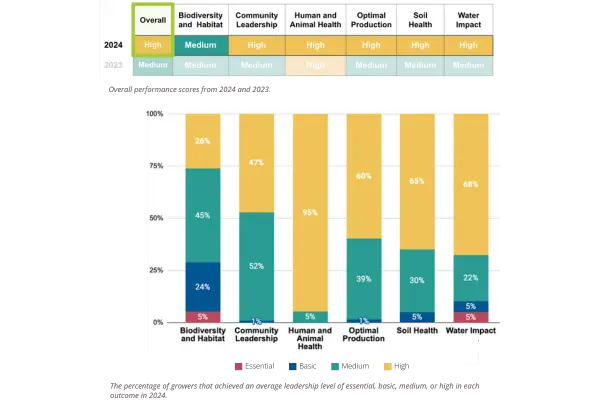 In this report, participating growers achieved an overall performance score of High, increasing from Medium in 2023. The High performance score reflects the broad implementation of advanced practices and technologies that promote long-term profitability, reduce risk, conserve natural resources, and generate value beyond the farm.