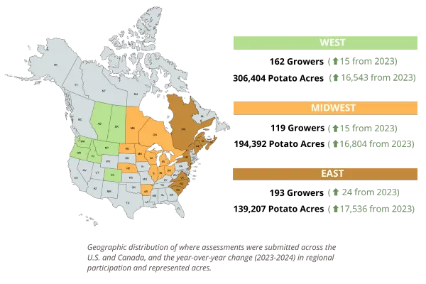 In 2024, a total of 474 growers, representing 640,002 potato acres across the U.S. and Canada, participated in the PSA Program by completing the Sustainable Outcomes in Agriculture (SOA) Standard through the CropwiseTM Sustainability (CWS) app and selecting PSA as their sustainability partner. This acreage represents approximately half of all harvested potato acres in North America.