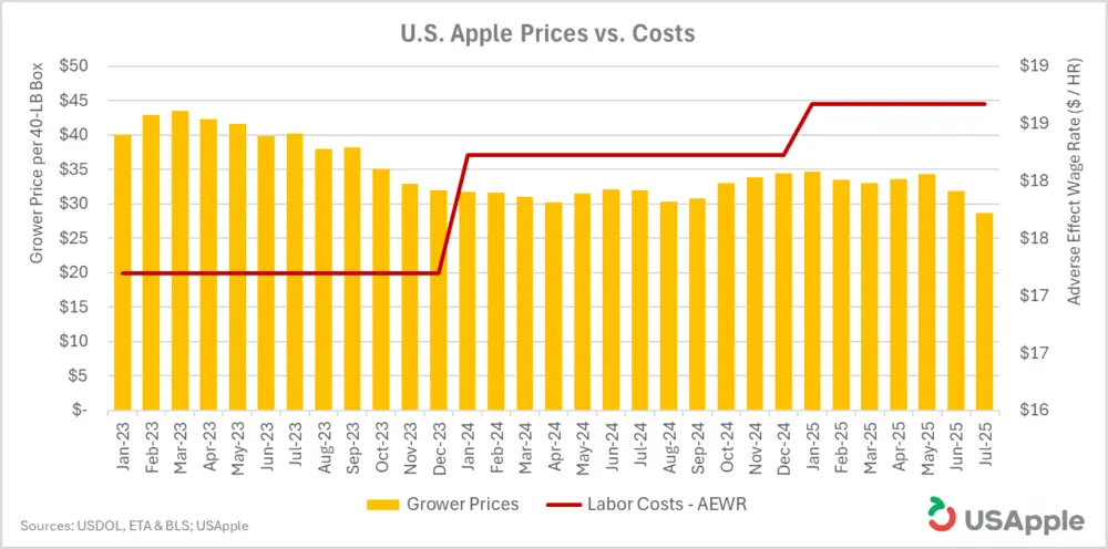“In less than three years, grower prices for apples have fallen 28 percent, while labor costs over that time have risen 9 percent, and 60 percent over the last decade,” said Jim Bair, President and CEO of the U.S. Apple Association (USApple). “The economic strain of that picture is seen in the thousands of growers that are just barely hanging onto their farms, many of which have been passed down through generations.”