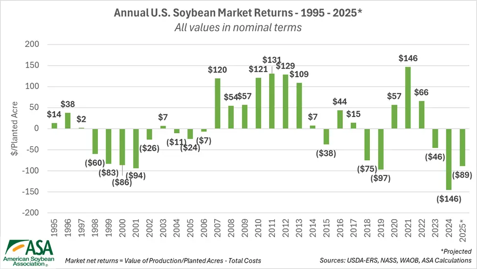 The rising input costs mean farmers are paying more than ever to grow their crops, often at a loss. An ASA economic analysis projects soybean farmers will net an $89 per planted acre market loss on their 2025 crops.