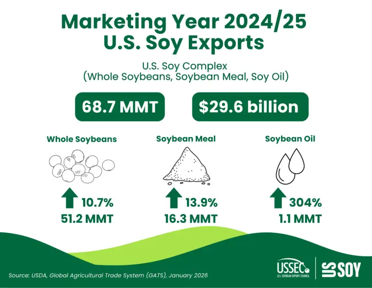 CHESTERFIELD, Mo., Jan. 20, 2026 — The United States exported 68.7 million metric tons (MMT) of U.S. Soy (whole soybeans, soybean meal and soybean oil) during marketing year (MY) 2024/25. That represents a 12.8% increase year-over-year (YOY) and a 2.95% gain over the 5-year average, according to data from the U.S. Department of Agriculture Global Agricultural Trade System (USDA GATS).