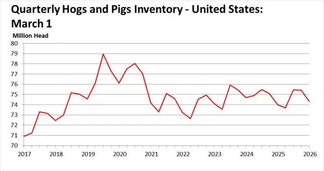 (Washington D.C.) – As of Mar.1, there were 74.3 million hogs and pigs on U.S. farms, up slightly from March 2025 but down 1% from Dec. 1, 2025, according to the Quarterly Hogs and Pigs report published today by the U.S. Department of Agriculture’s National Agricultural Statistics Service (NASS).