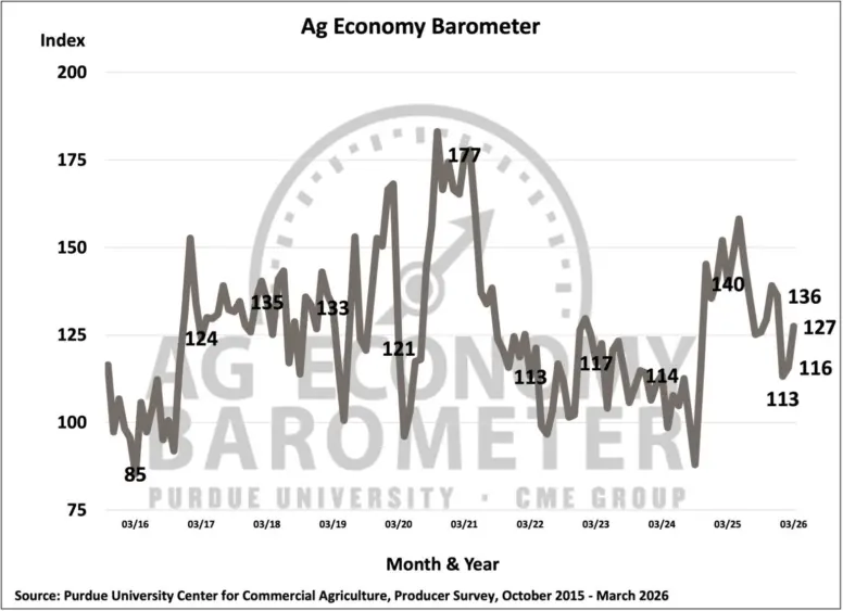 Read the full Ag Economy Barometer here: https://ag.purdue.edu/commercialag/ageconomybarometer/farmer-sentiment-improves-despite-rising-input-costs-concerns/?utm_source=delivra&utm_medium=email&utm_campaign=AgBarometer_20260407&utm_id=49351670