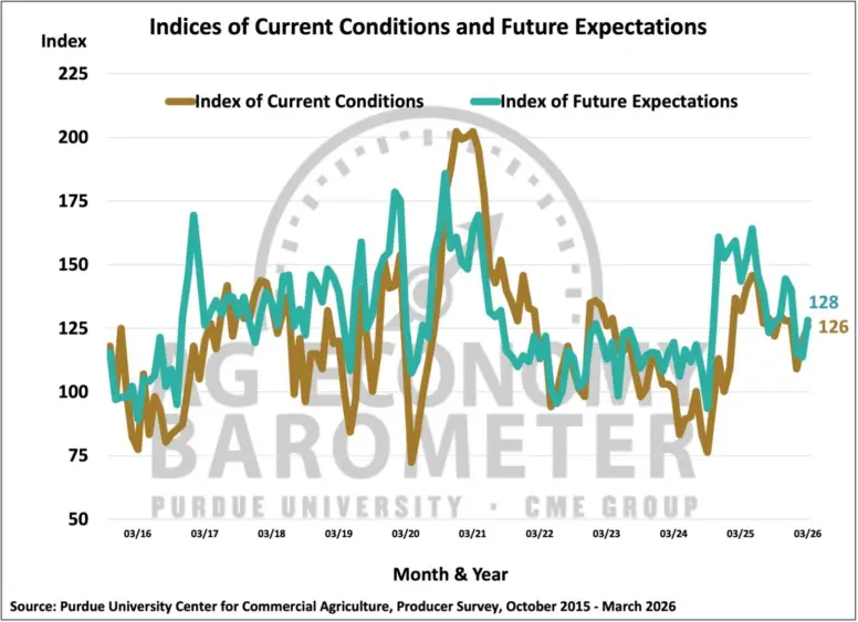 Farmer sentiment improved in March as the Purdue University-CME Group Ag Economy Barometer (AEB) Index rose from 116 points in February to 127 (see Figure 1). The Current Conditions Index increased by 6 points, while the Future Expectations Index increased by 14 points (see Figure 2). The Future Expectations Index this month was still 12 points below last year’s December index, and 16 points below last year’s March index. The percentage of respondents who cited high input costs as their biggest concern increased from 44% to 46% this month. However, the percentage of respondents who think the U.S. is headed in the “right direction” and who expect land prices to be higher five years from now also increased. The March barometer survey was conducted among 400 farmers across the nation from March 16-20, 2026.