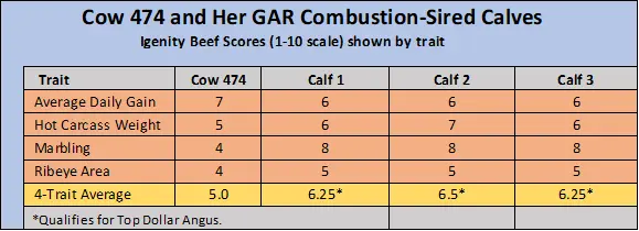 Top Dollar Angus recently completed a small-scale project which illustrates how genetically superior feeder cattle can be created in one generation. We started with a single beef cow, tag number 474, who has mediocre genetics for growth and carcass traits. Her Igenity Beef® scores averaged 5 out of 10 for Average Daily Gain, Hot Carcass Weight, Marbling and Ribeye Area. 474’s Average Daily Gain score is favorable at 7 out of 10. However, she’s average or below for the other three traits. This cow qualifies as an “okay” starting point for breeding genetically valuable feeder calves. Not great, but not bad either.